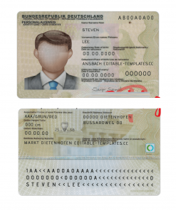 Fully editable template of the larger German identity card issued between 1 April 1987 and 31 October 2010, valid until 30 October 2020. The holographic eagle – part of the Identigram feature added in 2001 – can be seen on the right.