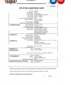 A death certificate is either a legal document issued by a medical practitioner that states when a person died, or a document issued by a government civil registration office, that declares the date, location and cause of a person’s death, as entered in an official register of deaths.